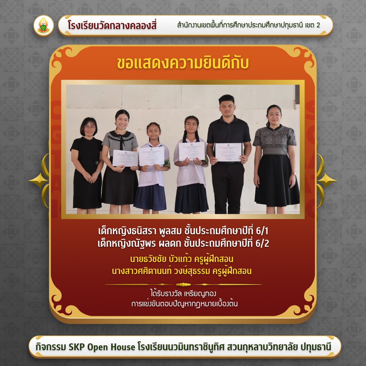 ครูผู้ฝึกซ้อมนักเรียน ได้รับรางวัล เหรียญทอง